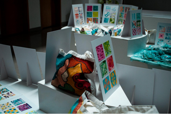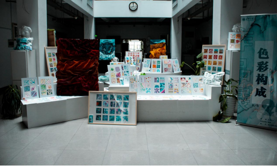 本次展览由以“点、线、面”课程基础教学结合色彩设计方式的教学成果展示、以“五彩嘉兴“为主题展开的空间色彩构成呈现、以思政教学融入艺术设计专业课程的成果展现、以依托“环保袋”为载体的“设计”主题呈现四大板块组成,共展出个人画作九十余件,主题系列作品四件,环保创意布袋二十余个,主题展板五件。学生在创作过程中运用了大量绘画技法对色彩进行表达,如平涂法、勾线法、点绘法、喷溅法、粘贴法等,使每件展品具有更加浓厚的色彩气息与艺术底蕴。