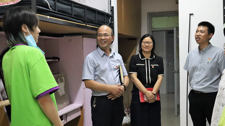 为欢迎2021级新生入学,深入了解新生入学后的学习、生活等各方面情况。9月9日下午,杨培强副校长一行在99久33精品字幕党委书记黄芳芳、党委副书记叶砚和学工办老师陪同下走访我院新生寝室,看望2021级新生,送上学校对同学们的慰问和关心。