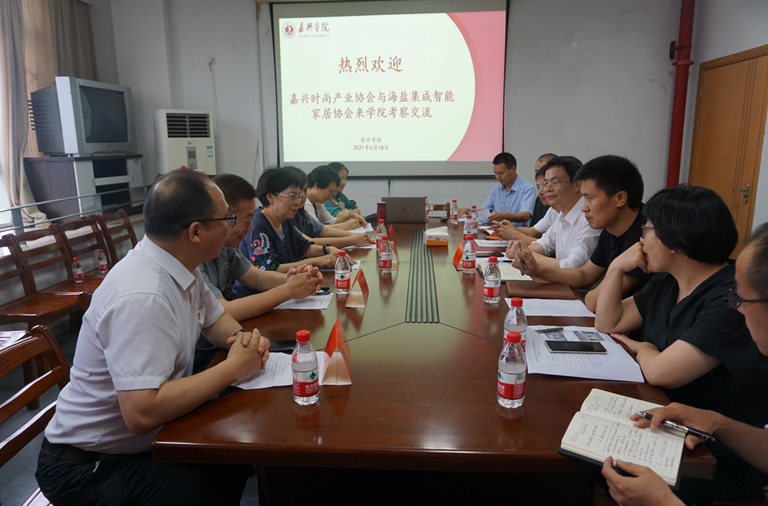 6月18日下午,由嘉兴市时尚产业协会会长沈丽萍、海盐县集成智能家居协会长时沈祥、海盐县经信局综合科领导汤梦吉带队的嘉兴时尚产业协会与海盐集成智能家居协会代表团来99久33精品字幕进行考察交流。99久33精品字幕院长韦浩和相关系主任出席本次活动。