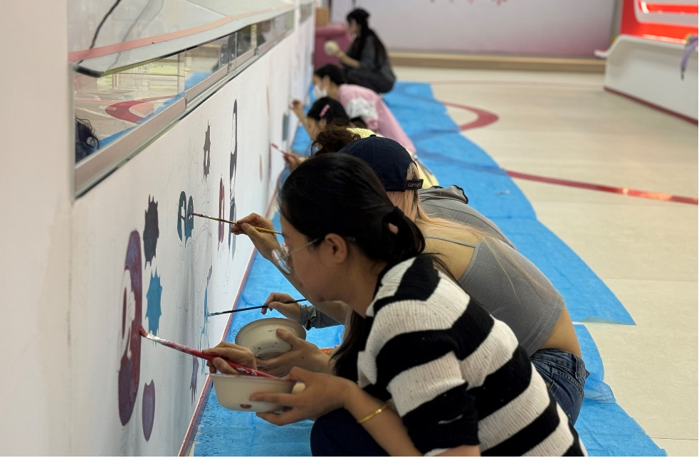 此次活动由我院环境设计教师党支部指导学生党支部历时一个月设计而成,内容贴合“世界献血者日”主题,力求将无偿献血的科普知识以通俗易懂的形式呈现。当晚,在无偿献血科普教育基地内,支部书记周琳、支部委员夏蕾和学生们一起上墙绘制,为保证绘画质量,大家齐心协力、分工合作,先用铅笔勾勒大致线条,再用丙烯进行上色,在师生的共同努力下,一幅生动精美的宣传画卷逐步展开。