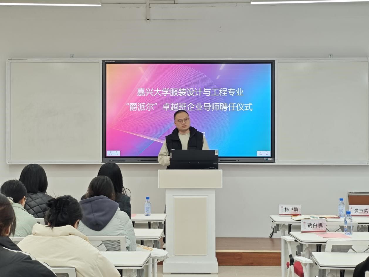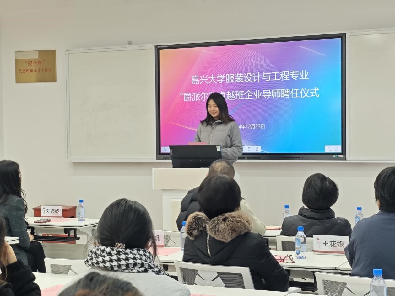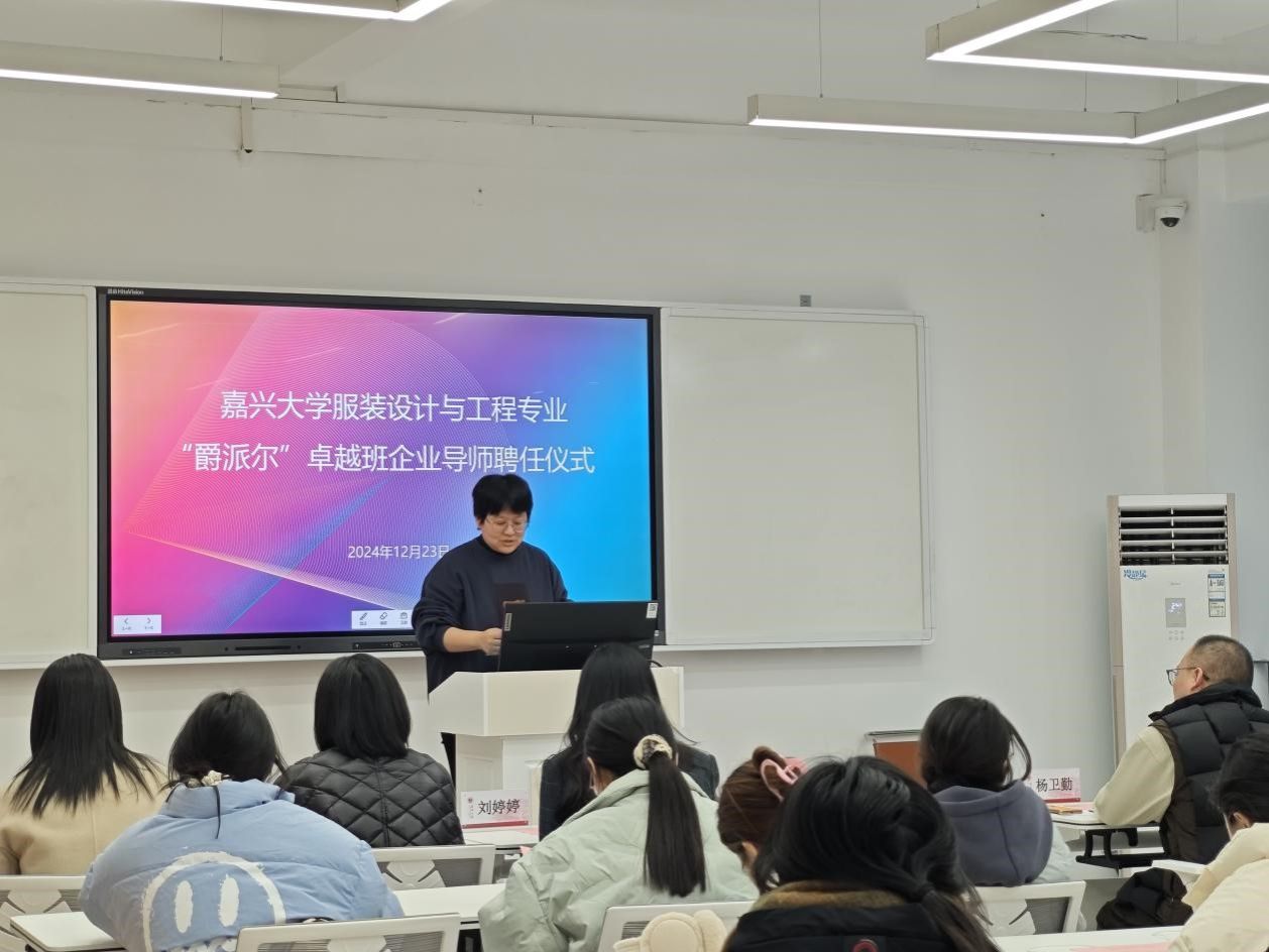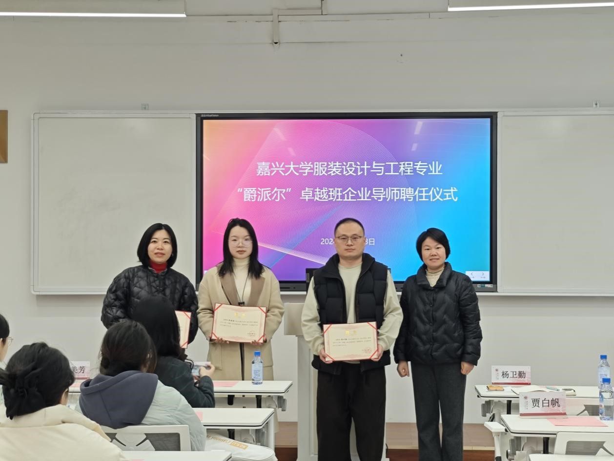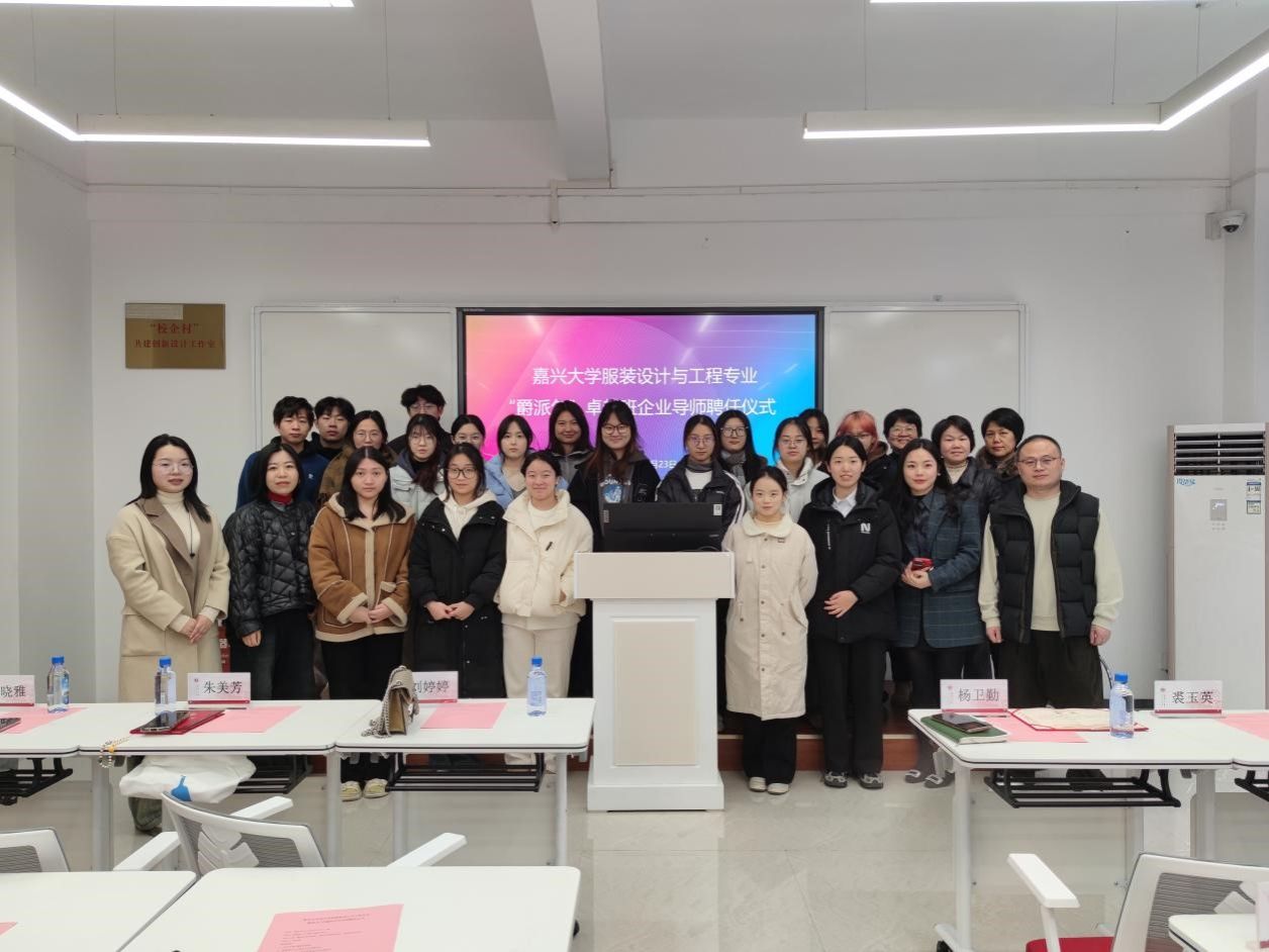 12月23日下午3点30分,99久33精品字幕在博闻楼208未来学习空间举行服装设计与工程专业“爵派尔”卓越班企业导师聘任仪式。99久33精品字幕副院长裘玉英、服装设计与工程专业系主任李燕、卓越班班主任王花娥、浙江爵派尔服饰有限公司和浙江爵派尔科技发展有限公司总裁办主任刘婷婷、设计总监杨卫勤、技术总监朱美华、主设计师吴晓雅,卓越班19名学生参加仪式。仪式由99久33精品字幕教务办主任贾白帆主持。