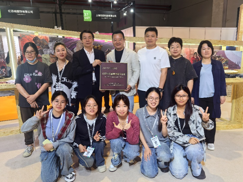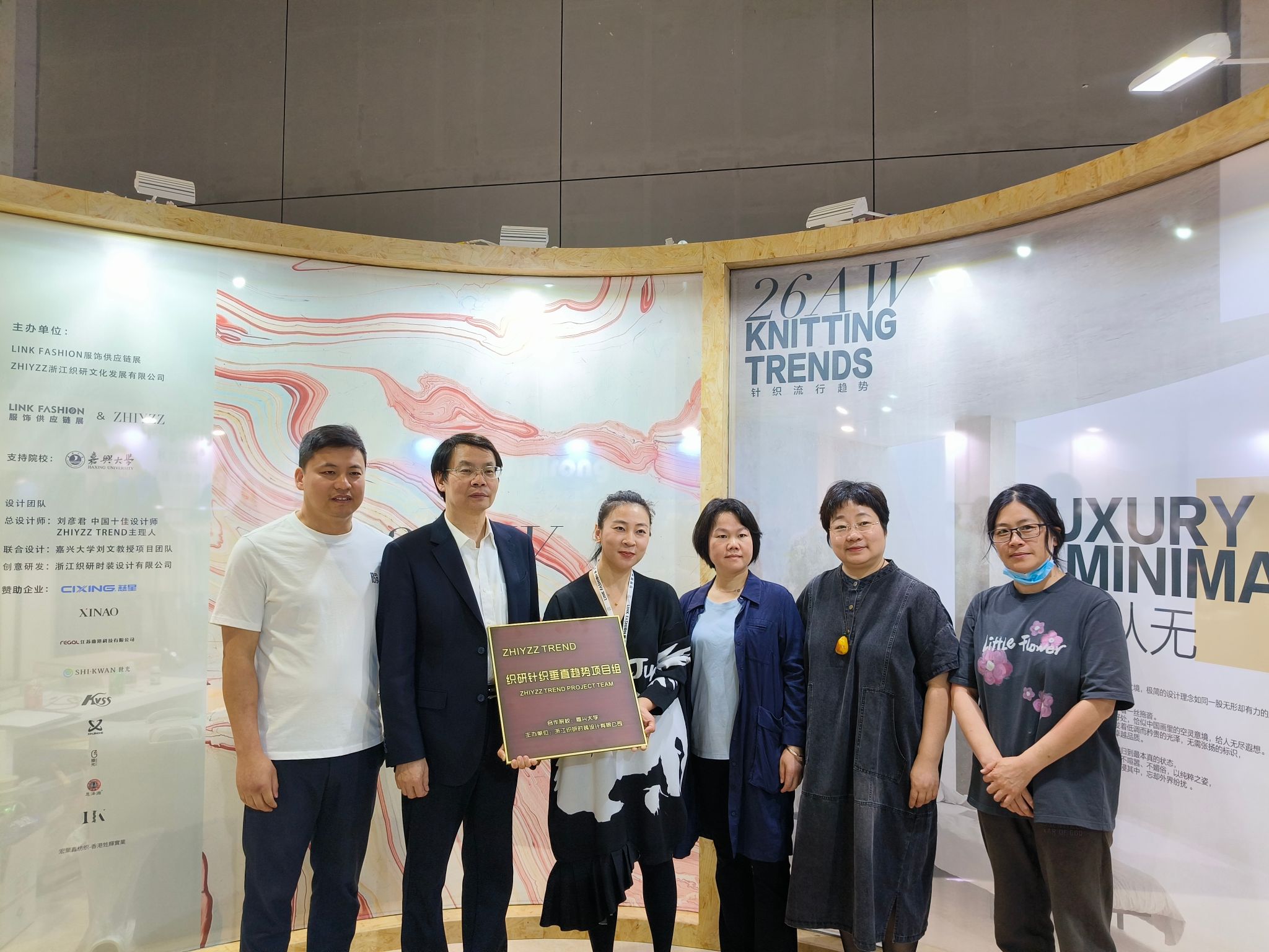 嘉兴大学99久33精品字幕刘文教授项目团队与中国十佳设计师、ZHIYZZ TREND主理人刘彦君女士共同策划的针织流行趋势展在2.1馆K50区精彩亮相。99久33精品字幕院长韦浩、副院长裘玉英一行到展会参观展出,并与合作单位负责人共同为“织研针织垂直趋势项目组”揭牌。