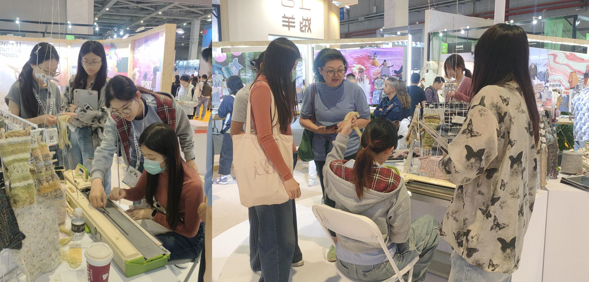 展区中央的三台手摇横机吸引了众多目光,嘉兴大学的学生陈星蓉、李烊垟、方心怡、曹宇航、王心怡正在现场演示手摇横机的操作,并与观众互动。他们表示,此次校企合作让企业和学校之间的融合更加紧密,极大地提升了专业技能和实践能力。