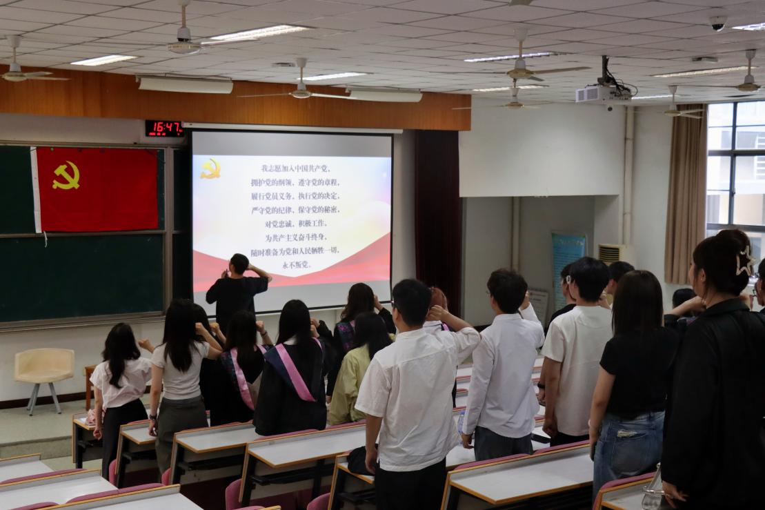 省级优秀毕业生黄汝杏同学作为毕业生党员代表,结合自身大学期间的学习、实践经历,分享了作为党员在思想、学习、工作中的成长体会。学生支部书记们也为毕业生党员送上了深情的寄语。他们希望毕业生党员在今后的工作和生活中,牢记党员身份,坚定理想信念,勇于担当作为。颜姚炜老师对毕业生党组织关系转接的政策和具体流程进行了解读,提醒党员们务必高度重视转接工作,确保组织生活的连续性与稳定性。最后,全体毕业生党员面向党旗庄严高举右拳,重温入党誓词。