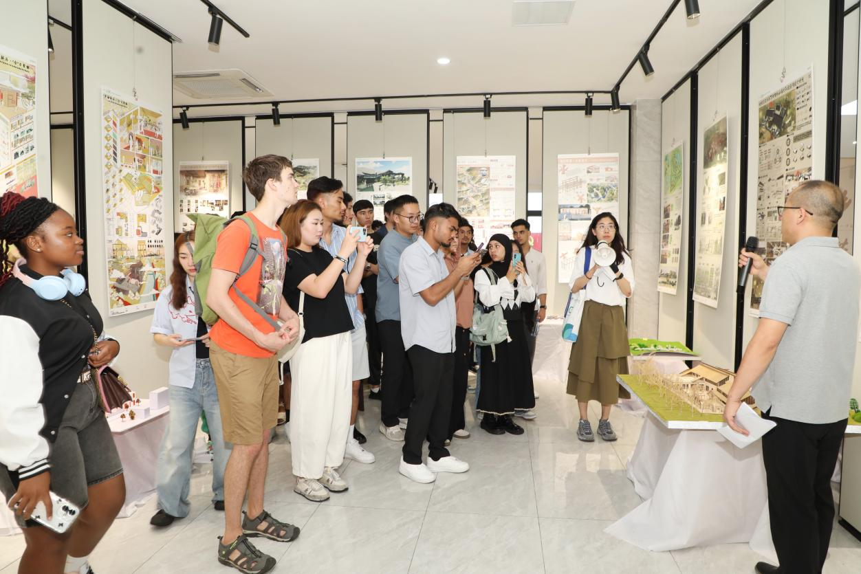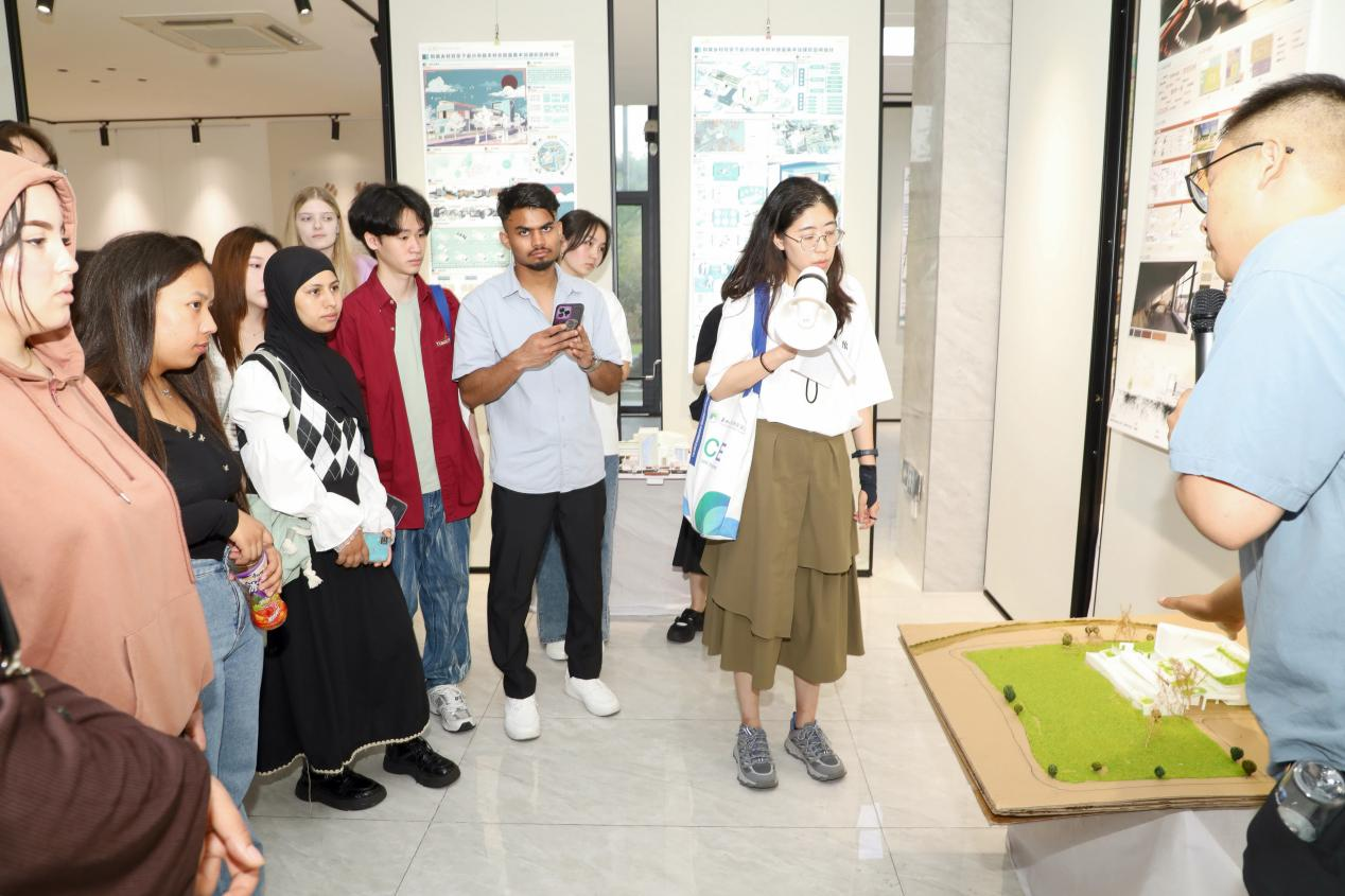 毕业设计展览现场,赵斌、李佳、余俊杰等师生为150多名国际留学生详细讲解本届毕业设计作品的设计思路、制作过程及嘉兴优秀非遗文化,让世界各地的留学生了解嘉兴文化、讲好中国美丽乡村故事。