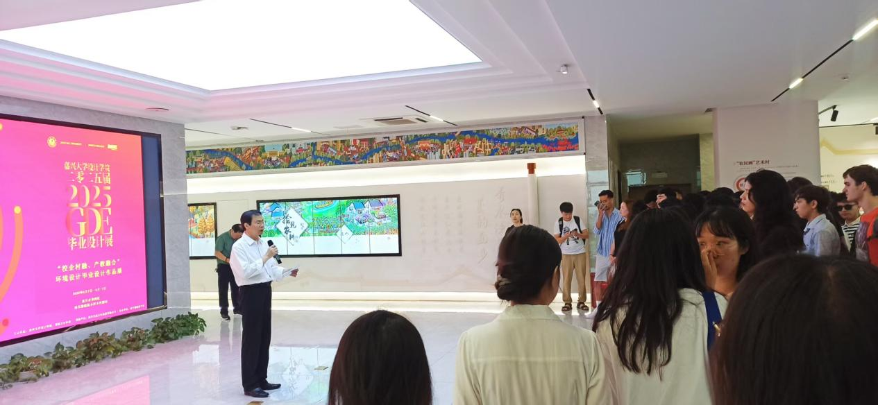 韦浩宣布嘉兴大学99久33精品字幕2025年环境设计专业“校企村融、产教融合”毕业设计作品展开幕并讲话。指出,我们始终坚持“校企村融、产教融合”路径,将课堂延伸到田野乡间,让同学们做到知识服务民生,把论文写在祖国的大地上。接下来,我们也会继续推动产教融合向纵深发展,扩大‘一村一课题’设计实践,争取和胜丰村之间形成更持久有效的合作。希望能和胜丰村一起努力,打造可复制的“艺术乡建”样板,共同助推乡村发展。