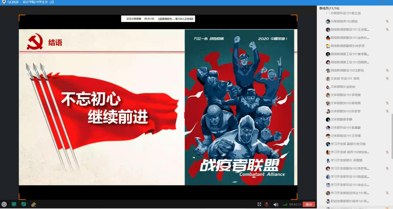 会后,部分同学还发表了他们对本次“云思政”课堂的感想。如练施艺同学说:“一个个革命先烈的故事让我深刻体会到是中国共产党人的浴血奋战、艰苦创业才使我国人民的前途命运发生了根本性转折。我们如今的幸福生活来之不易!”叶悦同学说:“我们要领悟先辈们矢志不渝、百折不挠的斗争精神,不忘初心、牢记使命、甘于奉献的理想追求。我们要深爱着我们的祖国,共筑美好家园!”胡诗倩同学说:“崇高的理想信念是革命老前辈给我们留下的宝贵精神财富,在新时代我们要继续传承,牢记老一辈共产党人在革命初期的历史使命,为实现‘两个一百年’的奋斗目标和中华民族伟大复兴的中国梦而不懈奋斗。”