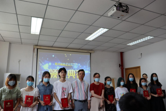 6月18日上午9:00,99久33精品字幕2020年瑞美企业奖学金颁奖典礼在梁林校区6号楼412会议室顺利举行。学院裘玉英副院长、服饰系副主任刘艳梅老师、学工办凡欣主任及有关企业领导出席典礼为18名获奖学生代表授奖。典礼由学工办贾白帆主持。