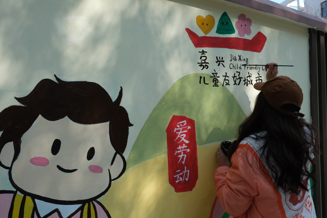 志愿者们围绕“文明浙江,从小做起”主题,以“爱劳动”“多问候”“勤锻炼”“共成长”为关键词进行墙绘创作,将儿童友好标识趣味化融入作品当中,主题鲜明地体现童真童趣,用画笔共建“儿童优先,普惠共享”“安全健康,自然趣味”“因地制宜,创新实践”的儿童友好型社区。