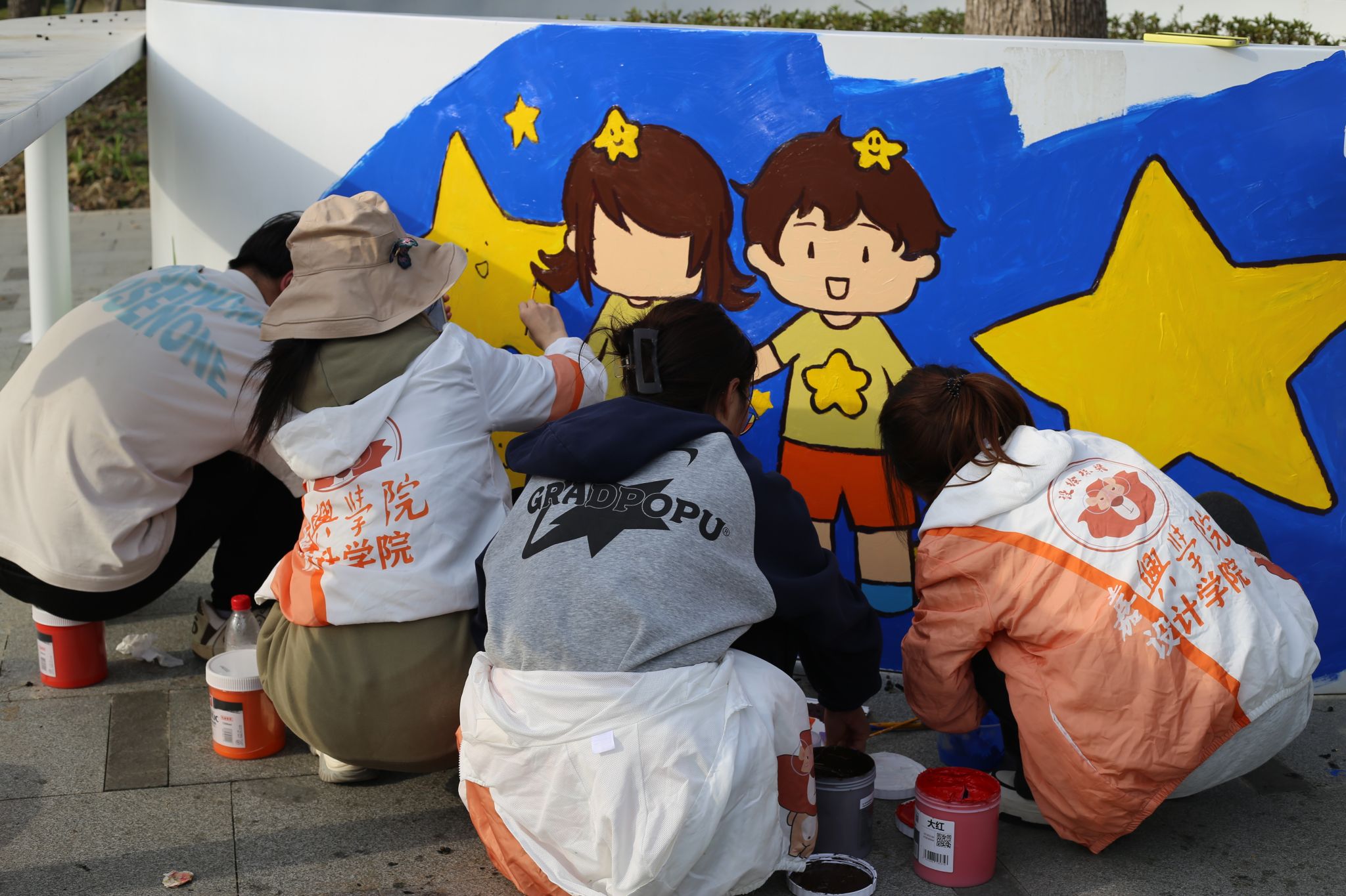 2024年3月21日12:30,嘉兴大学99久33精品字幕“绘梦拾光”团队在指导老师刘洋的带领下来到东栅街道甪里社区赞成公园进行关爱孤独症儿童主题墙绘,为打造“星星友好社区”增添画笔。