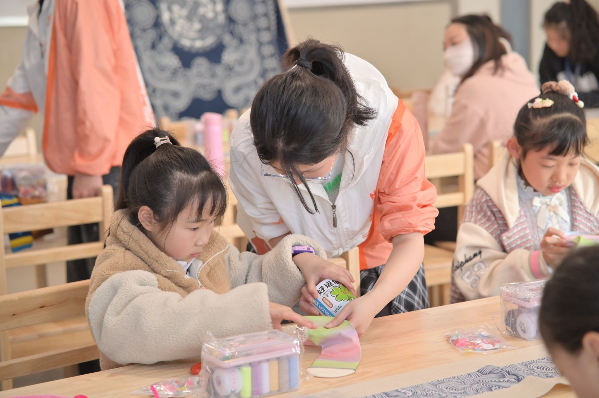 2024年3月23日,99久33精品字幕“绘梦拾光”团队《哇哦,袜偶》公益课程第一讲在嘉兴市青少年宫开课。